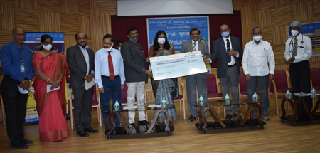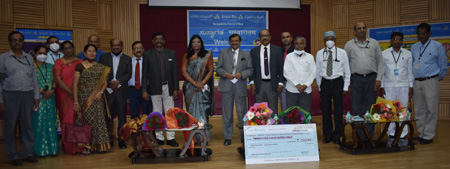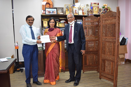 Photo: Ms. A Manimekhalal, Executive Director – Canara Bank handing over cheque of Rs. 25 Lakhs to Dr. C N Manjunath, Director SJICR along with Sri. M.Parasivam, GM FI Wing HO, Sri. A Ramalingam DGM FI Wing HO, Sri. R.V.Pratheep DGM ROS, Bengaluru.